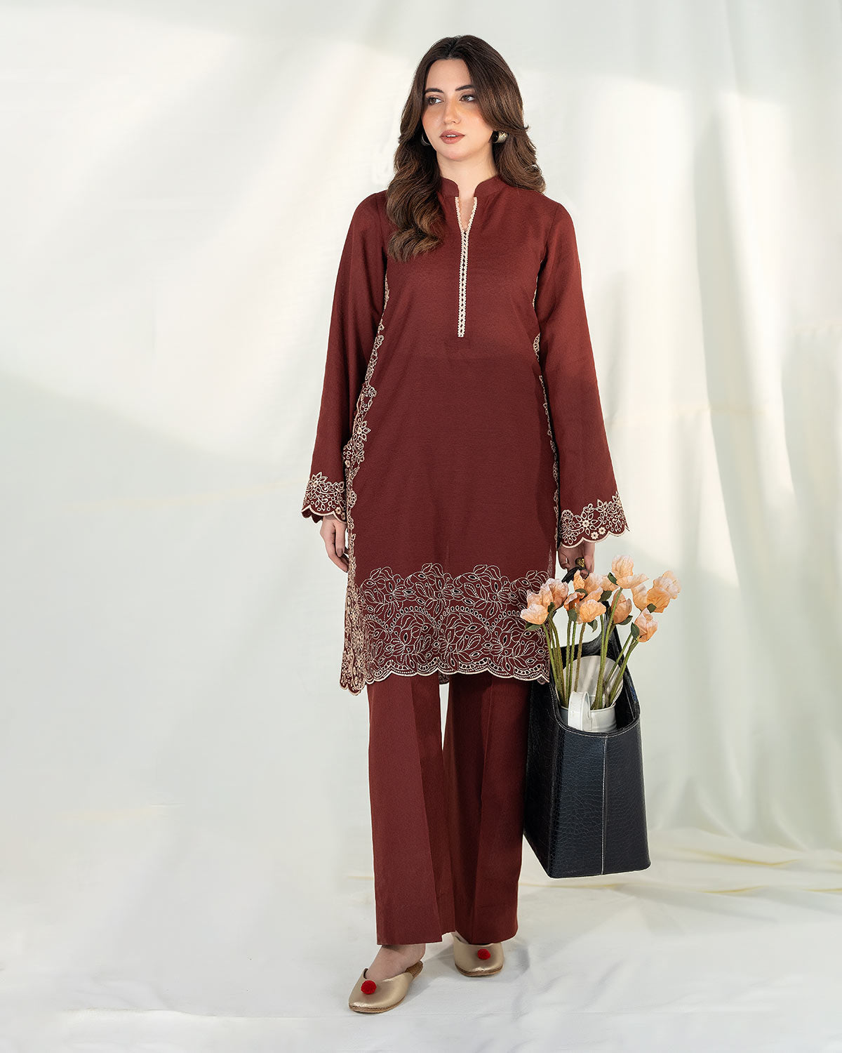 A luxurious chocolate-colored winter dress that exudes warmth. The rich, deep hue of the dress is beautifully complemented by off-white embroidery, delicately placed along the bottom hem and sleeves. The intricate embroidery adds a subtle contrast,m giving the dress a sophisticated yet artistic touch. Crafted from a cozy, winter-friendly fabric, this dress offers both comfort and style making it perfect for colder days.